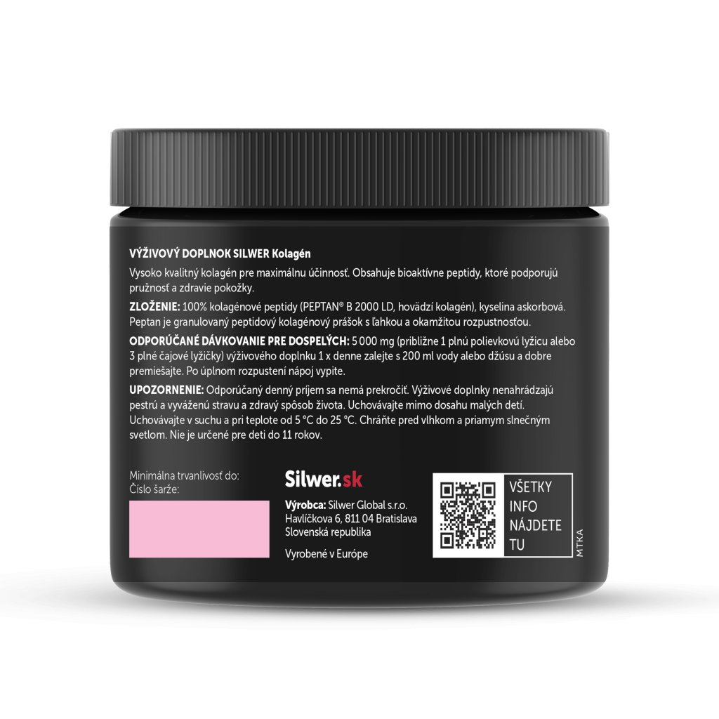 S pribúdajúcim vekom telo prirodzene stráca schopnosť produkovať dostatočné množstvo kolagénu, čo vedie k oslabeniu kože, kĺbov a šliach. Produkt SILWER Kolagén obsahuje vysokokvalitné bioaktívne peptidy PEPTAN®, vedecky overenú formu kolagénu typu I, ktorý tvorí až 90 % kolagénu v tele a je kľúčový pre pevnosť pokožky, kostí, šliach a väzov. Extra silnú dávku kolagénu dopĺňa vitamín C, ktorý prispieva k správnej tvorbe kolagénu a jeho lepšej absorpcii v tele.