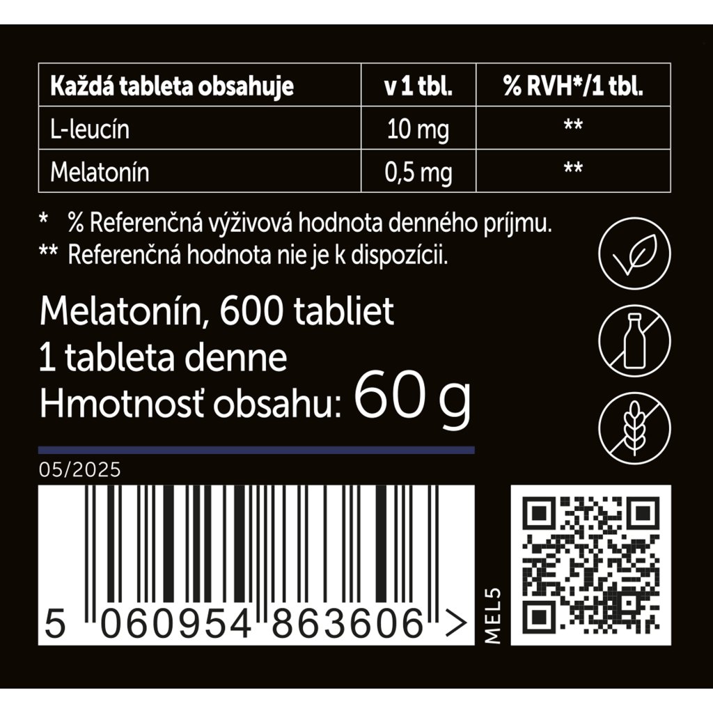 Každá tableta obsahuje aj aminokyselinu L-leucín, ktorá napomáha relaxácii a uvoľneniu organizmu pred spaním. Vďaka malému rozmeru sa tablety ľahko prehĺtajú, sú bez chuti a neobsahujú žiadne zbytočné prídavné látky – ideálne riešenie aj pre citlivejších užívateľov. Praktické balenie s 600 dávkami je zároveň výhodné aj z dlhodobého hľadiska.